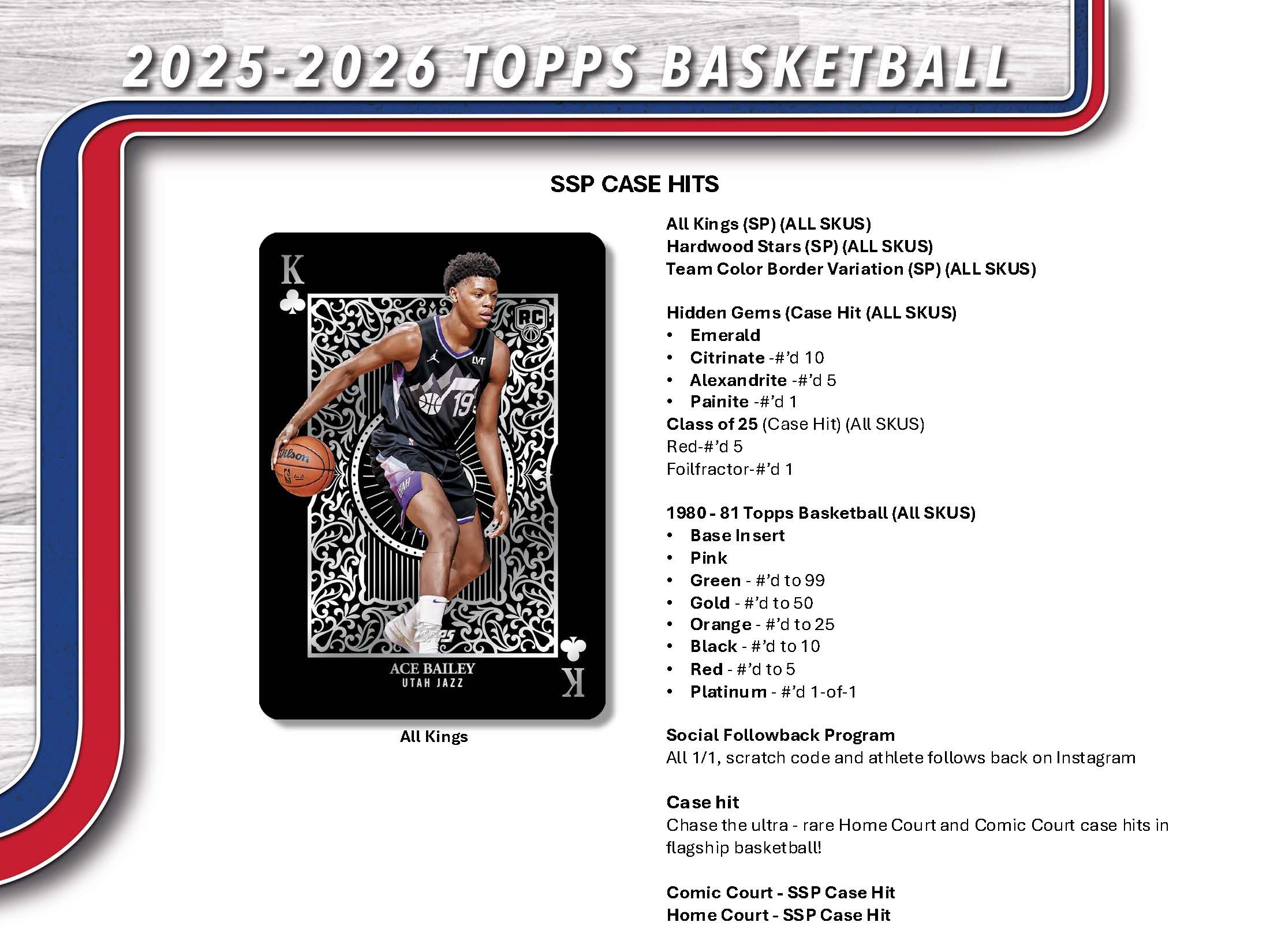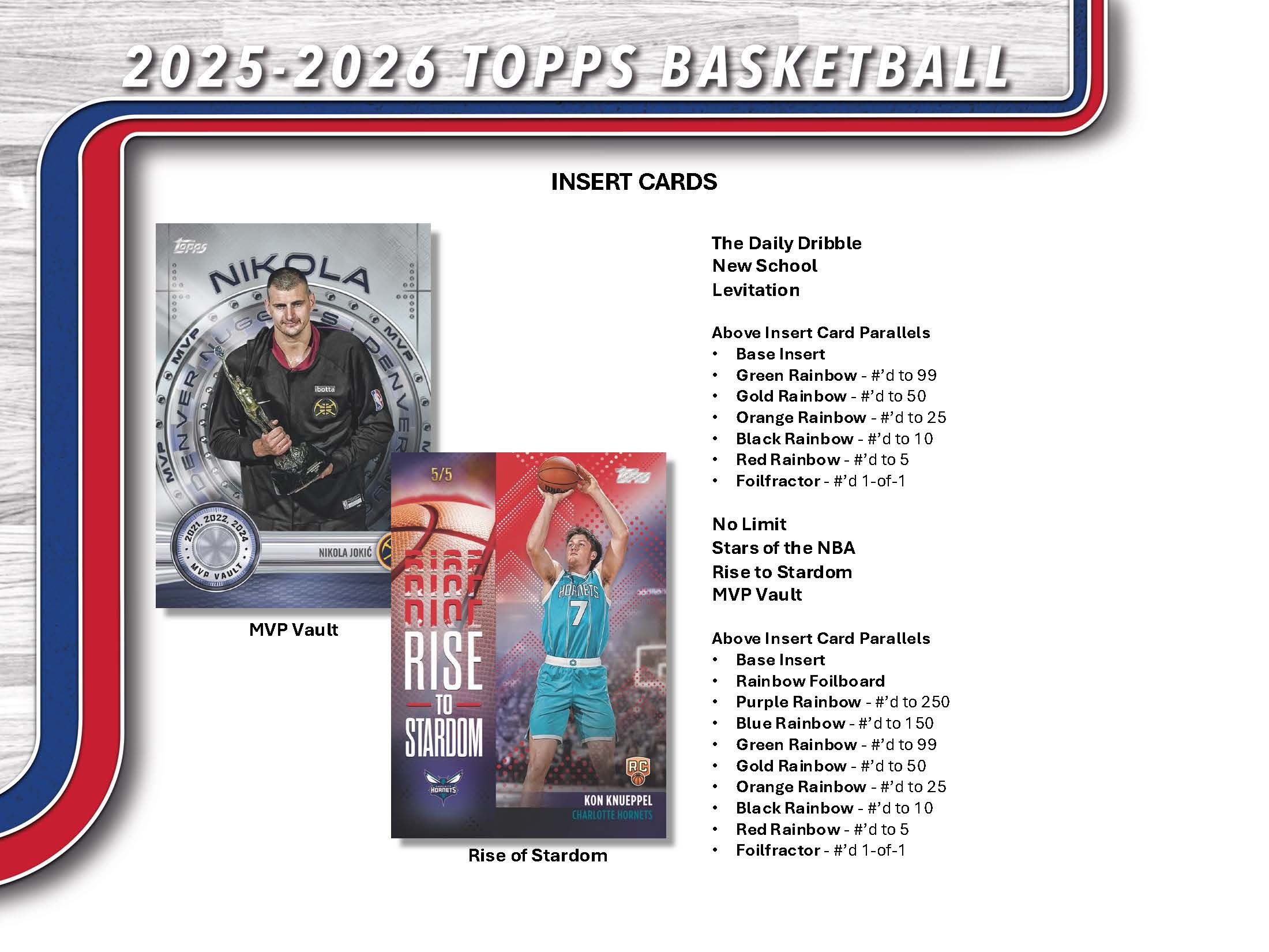 Each pack of 2025/26 Topps Flagship Basketball contains twelve (12) Base Cards. Each box contains two (2} Short Insert Cards, two (2) 1980-81 Topps Basketball Insert cards, seven (7) Insert Cards, four (4) Base Parallels including one (1) numbered parallel, one (1) Autograph or Relic card, and one (1) Promo Pack.