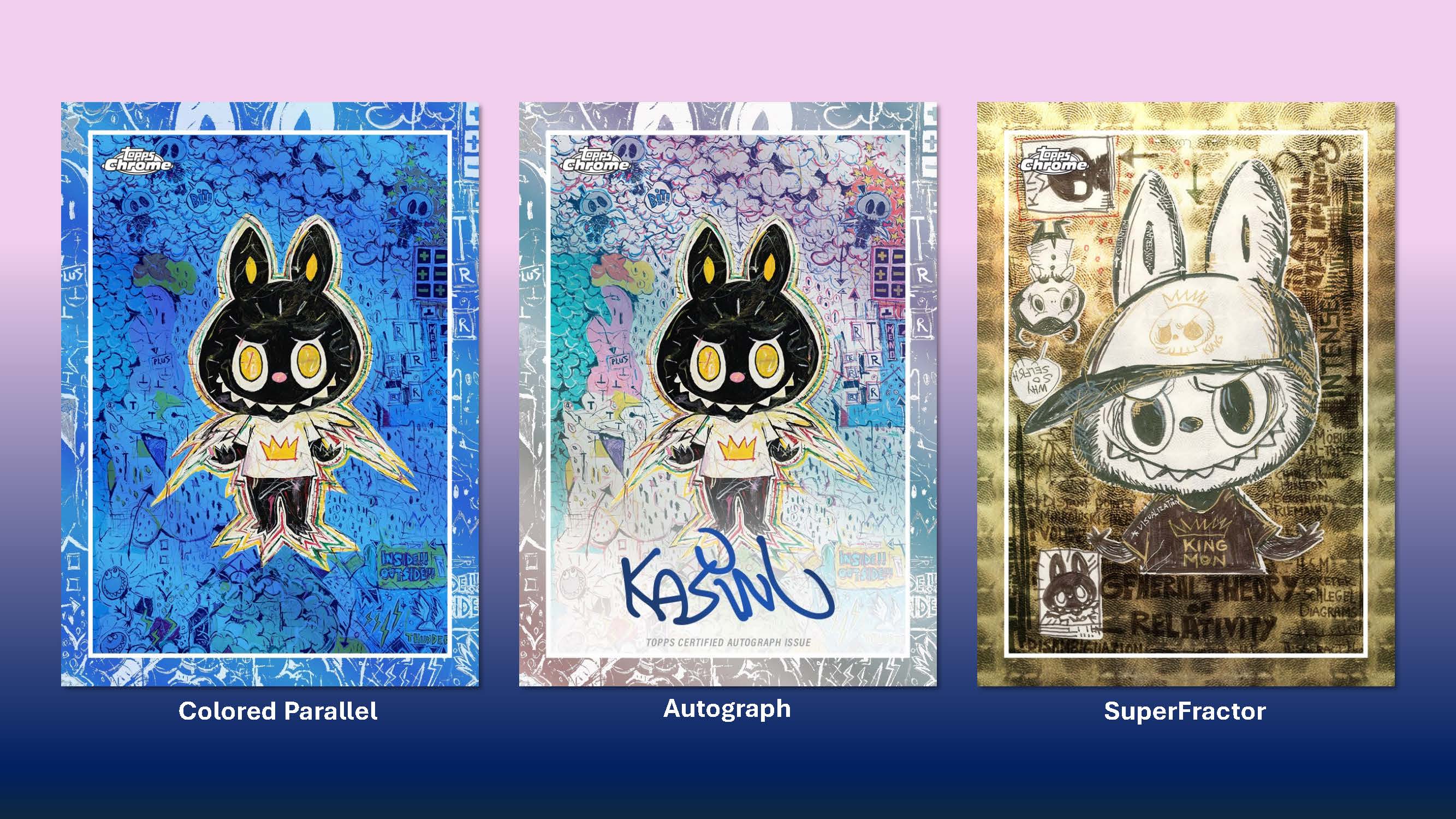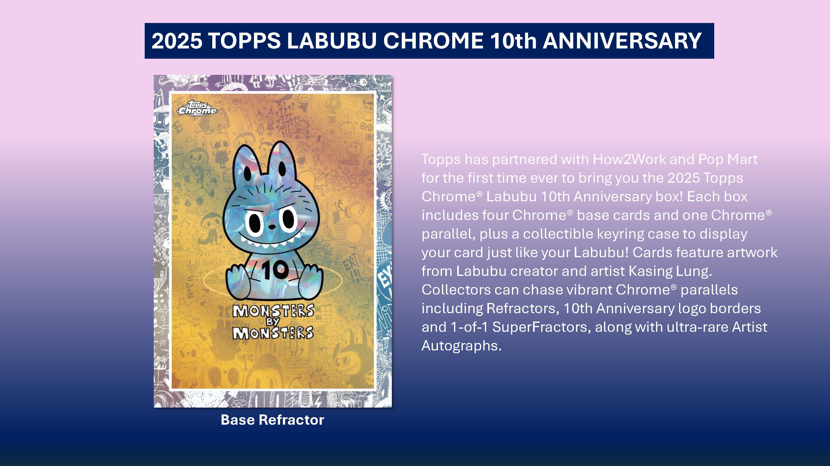 Topps has partnered with How2Work and Pop Mart for the first time ever to bring you the 2025 Topps Chrome® Labubu 10th Anniversary box! Each box includes four Chrome® base cards and one Chrome® parallel, plus a collectible keyring case to display your card just like your Labubu! Cards feature artwork from Labubu creator and artist Kasing Lung. Collectors can chase vibrant Chrome® parallels including Refractors, 10th Anniversary logo borders and 1-of-1 SuperFractors, along with ultra-rare Artist Autographs.