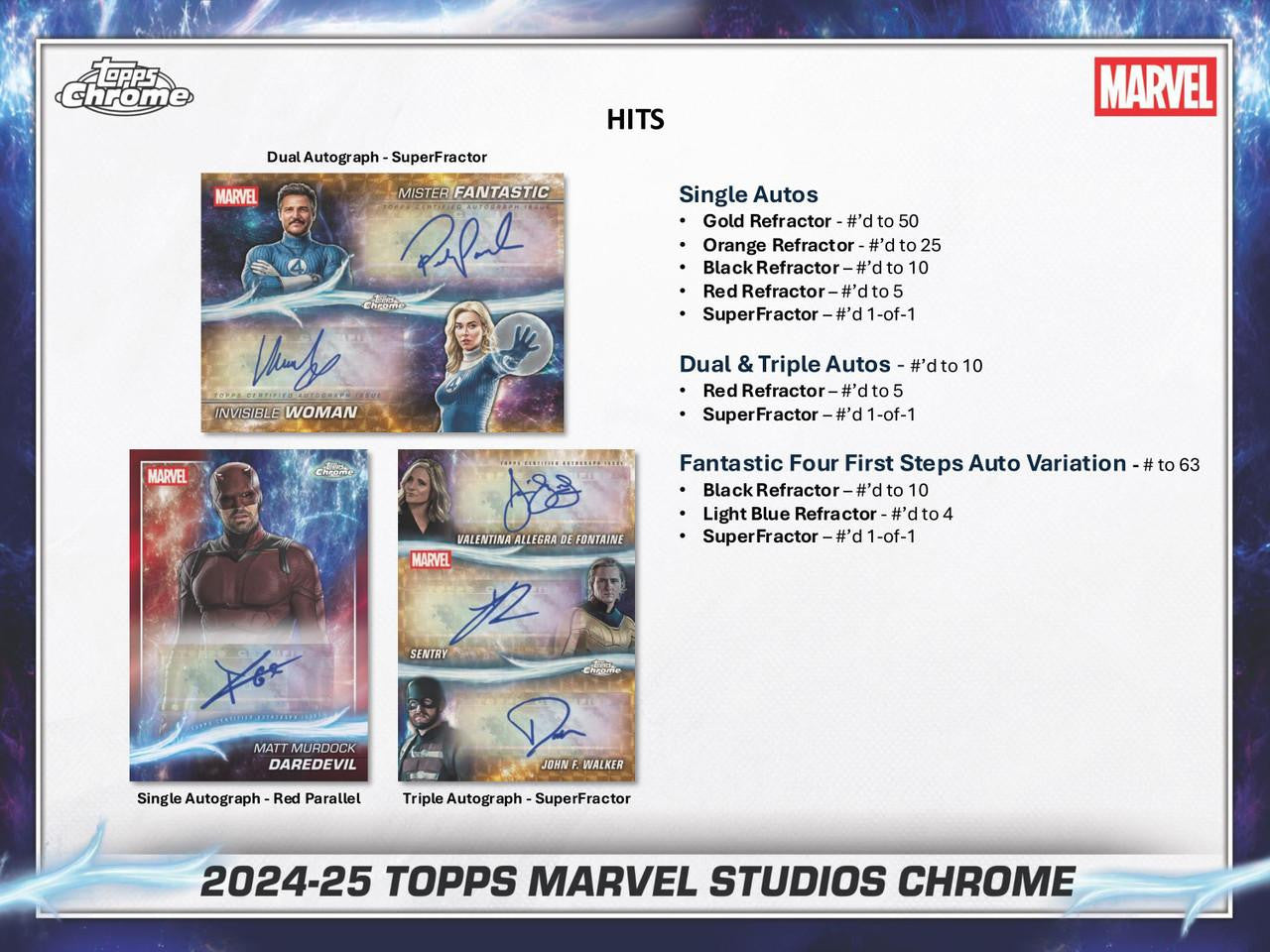 2025 Topps Marvel Studios Chrome arrives as the first ever Topps product featuring characters from the Marvel Cinematic Universe! Also look out for DEBUT cards featuring a brand-new, heroic medallion design indicating a character's first ever trading card!