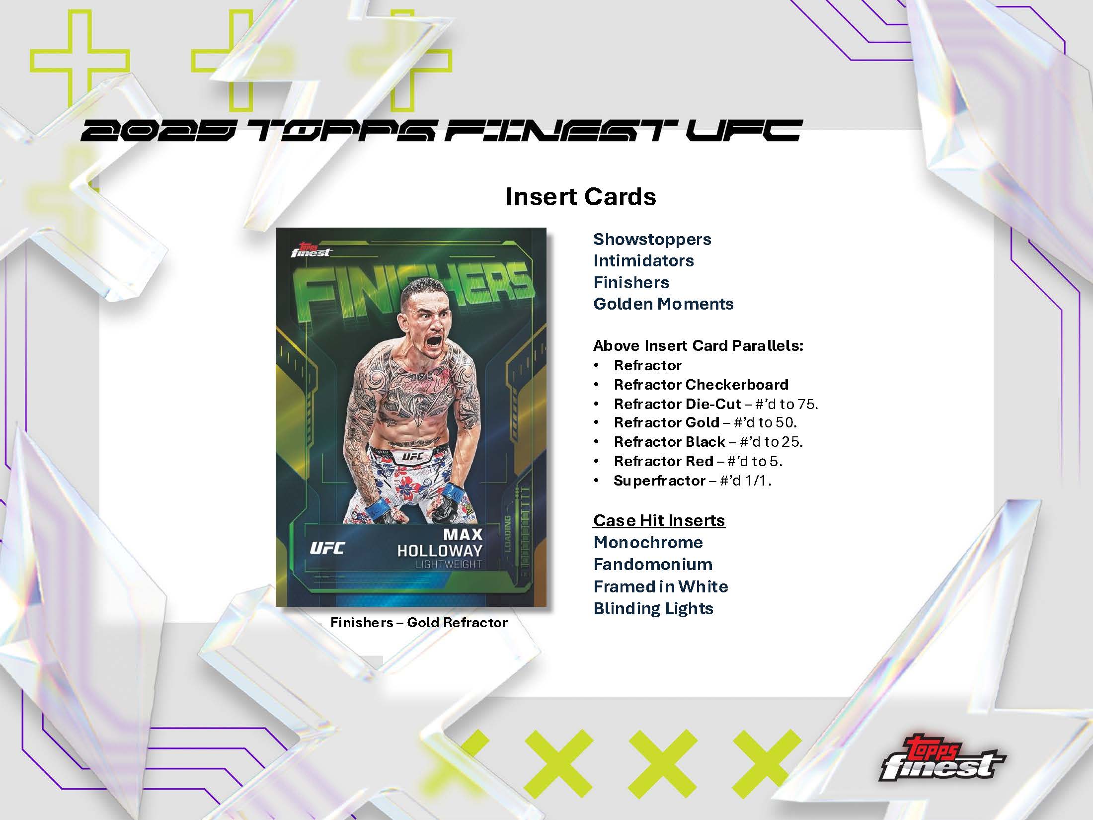 It’s Back!!! After a successful return to the hobby in 2024, Finest is back. 2025 Topps Finest UFC is bigger and better than ever in 2025 and features a wide variety of autographs, inserts, refractors and brand-new case hits!