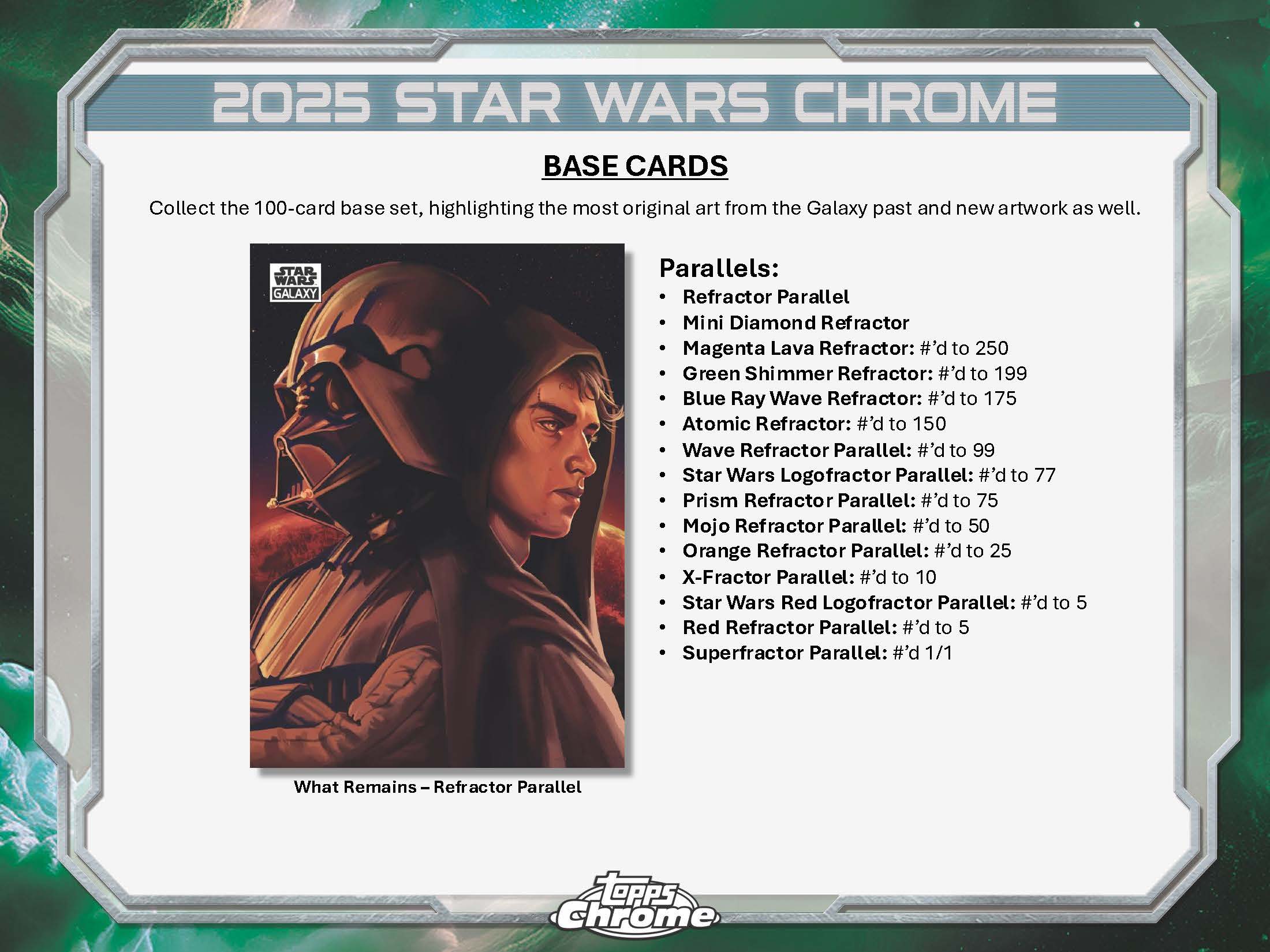 Each pack of 2025 Star Wars Chrome Galaxy contains four (4} cards, three (3) Base Card's and one (1) Refractor Parallel. Each box contains four (4) numbered parallels and three (3) Mini Diamond Cards. Each case contains one (1) Autograph Card, three (3) Sketch Cards.