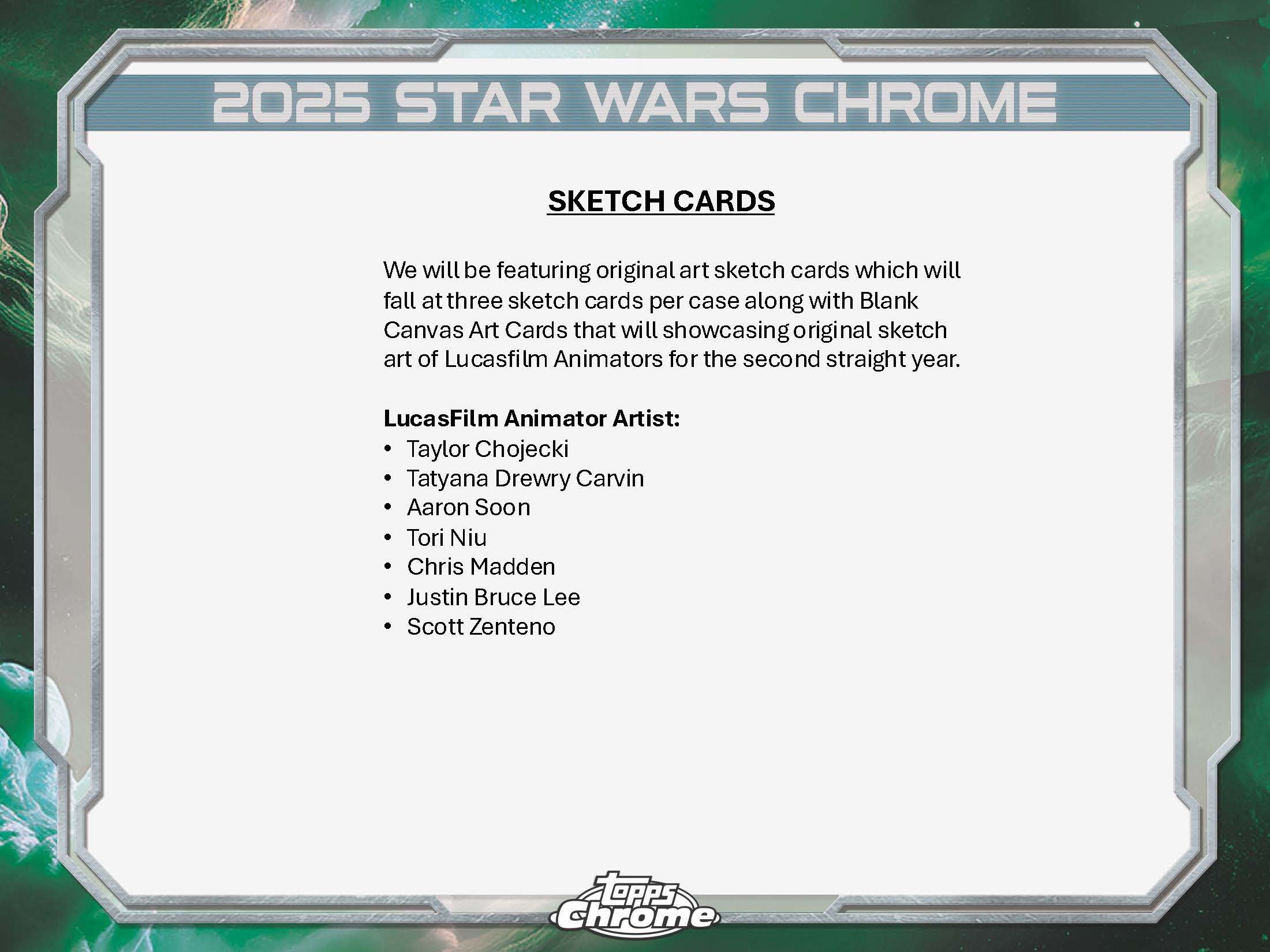 We will be featuring original art sketch cards which will fall at three sketch cards per case along with Blank Canvas Art Cards that will showcasing original sketch art of Lucasfilm Animators for the second straight year.