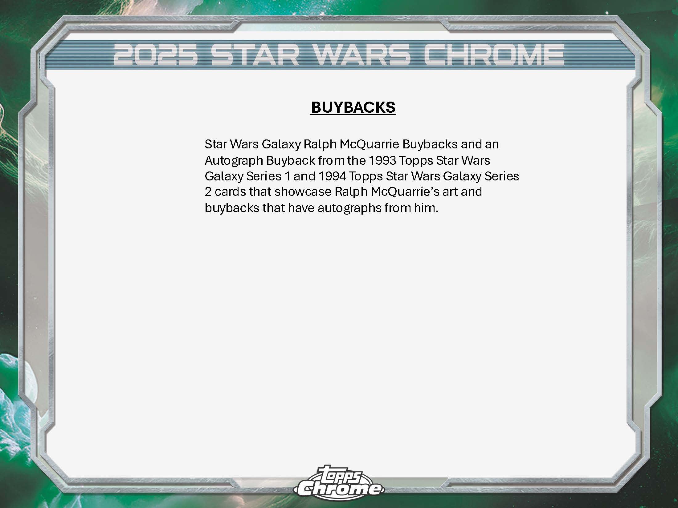 Star Wars Galaxy Ralph McQuarrie Buybacks and an Autograph Buyback from the 1993 Topps Star Wars Galaxy Series 1 and 1994 Topps Star Wars Galaxy Series 2 cards that showcase Ralph McQuarrie’s art and buybacks that have autographs from him.